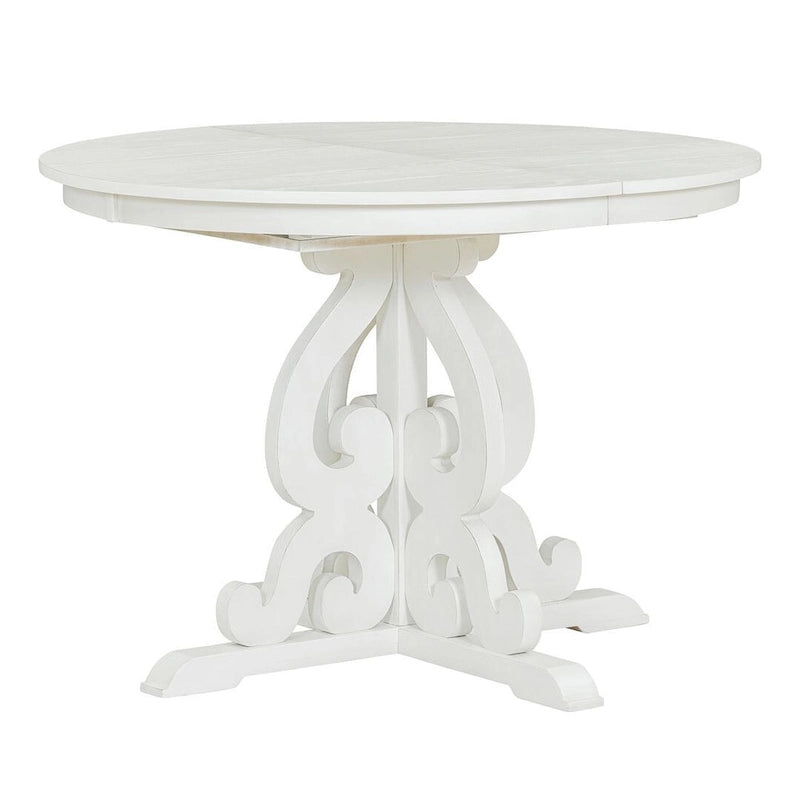 Elevate your dining space with our 5-Piece Retro Functional Dining Set. Crafted with meticulous attention to detail, this set exudes vintage charm with its symmetrical hollowed-out patterns and antique white finish. The extendable table features a removable 16-inch leaf, allowing flexibility for seating up to 6 guests. The solid wood construction ensures durability, while the upholstered chairs provide comfort with soft foam cushioning. Whether for your dining room or kitchen, this set combines elegance and functionality to enhance your home decor.