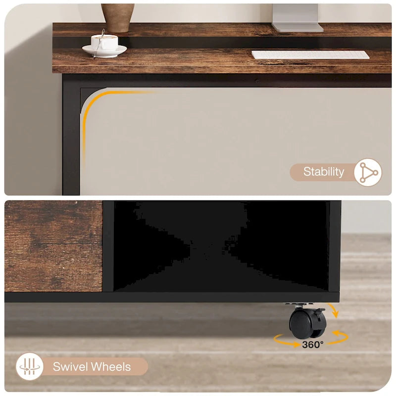 This executive office desk set combines a spacious computer desk and a 40 mobile file cabinet. The large desktop provides ample room for computers, monitors, printers, and work activities, while the rolling file cabinet includes four compartments, two drawers, and swivel casters for easy organization and mobility.
