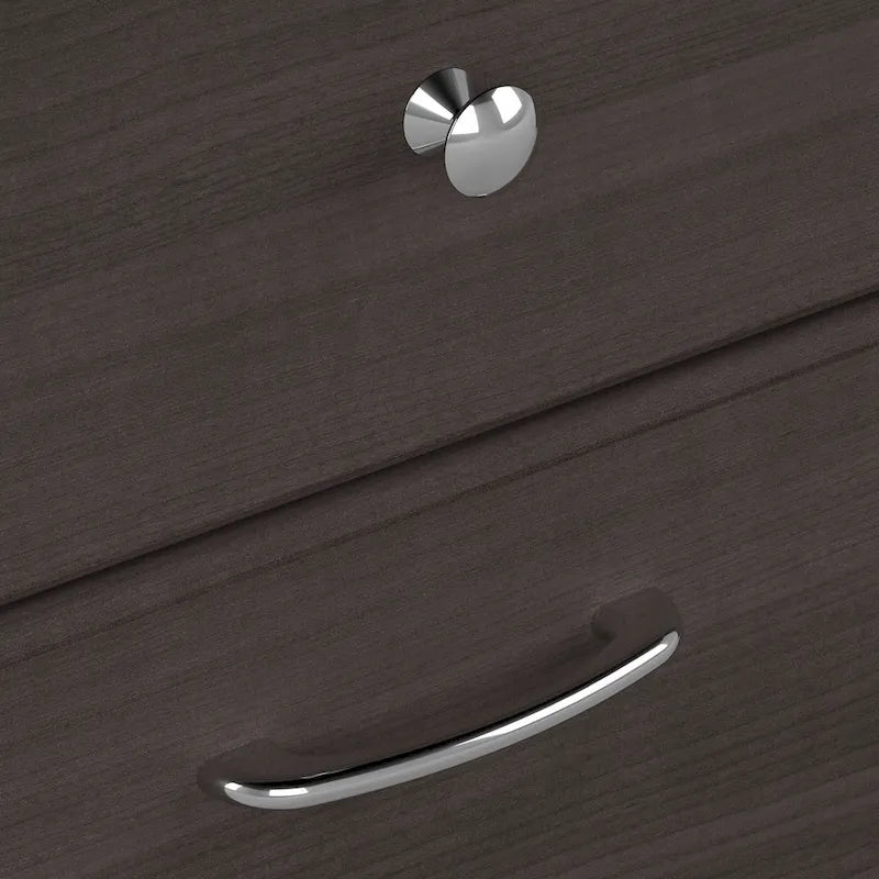 The Bush Furniture Cabot 60W L Shaped Computer Desk with Drawers presents a home office solution with transitional style. Take advantage of the 60-inch L Shaped Desk surface to spread out with a computer, books, and all the materials you need to power through your next project or assignment. The durable desktop supports up to 200 pounds and includes built-in wire management to keep cords and cables out of the way while you work. A single file drawer opens on smooth full-extension ball bearing slides for an effortless reach to letter, legal, and A4-size paperwork. The box drawer organizes writing utensils, notepads, and other small office supplies while the open cubby shelf is perfect for work-in-progress and frequently used materials. The L Desk is finished on all sides to look great facing any direction in your home office. Stylish metal hardware complements your choice of several traditional and contemporary finish options for an appearance that works with your own space and taste. This corner desk with storage has been rigorously tested to meet or exceed ANSI/SOHO quality standards for safety and performance and is backed by the Bush Furniture 1 Year Manufacturer's Warranty. See the full Cabot Collection for coordinating items to complete your transitional workspace, including office chairs, file cabinets, bookcases, and more (sold separately).