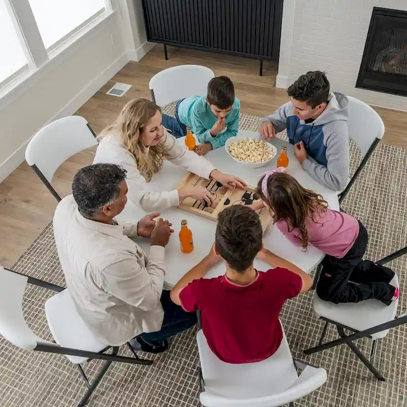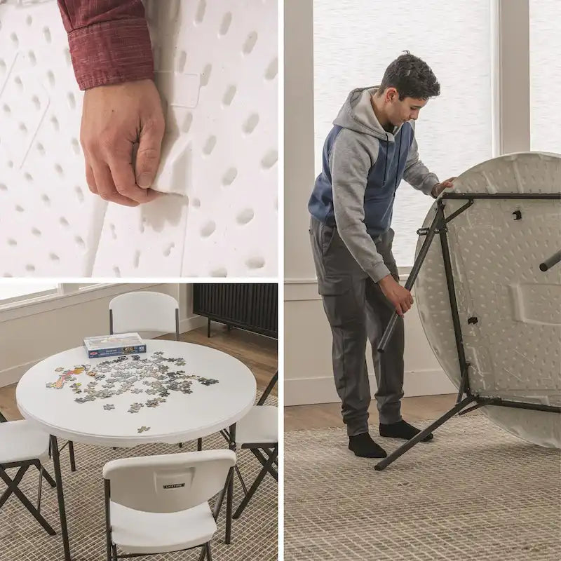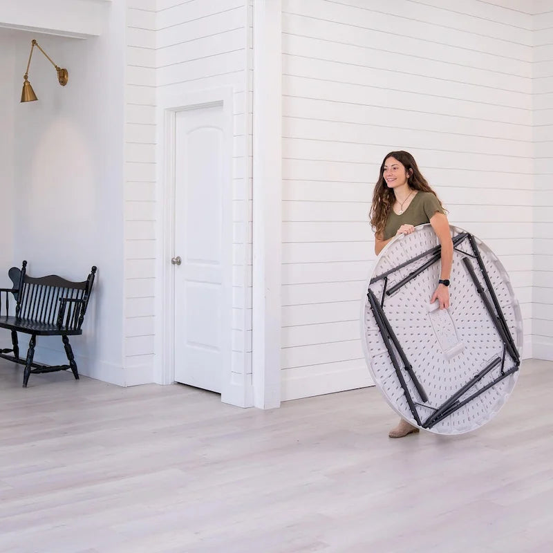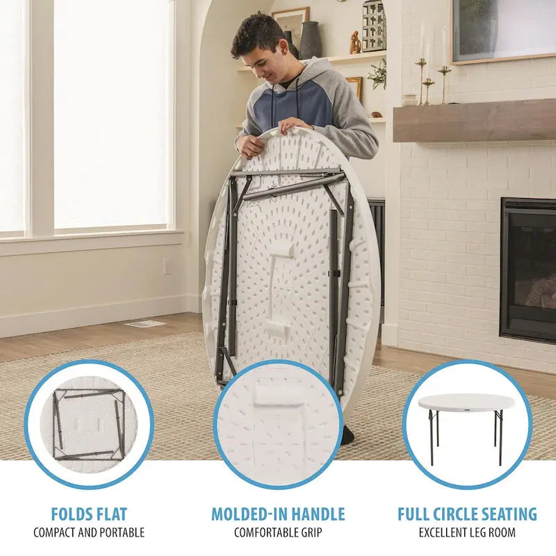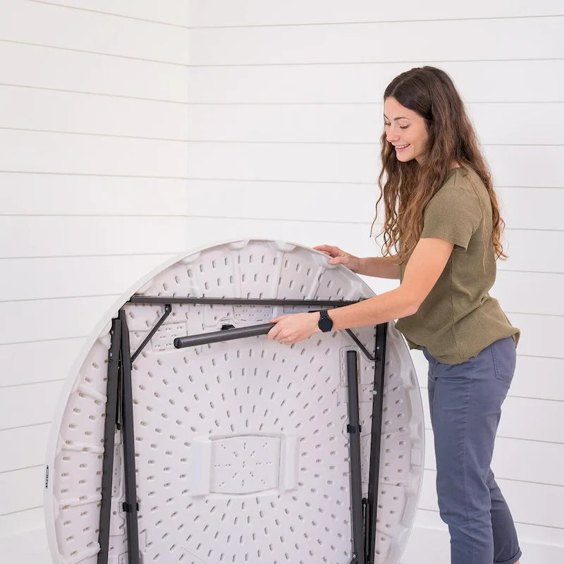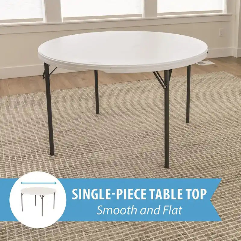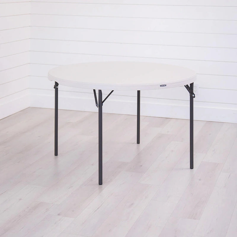 Whether you need quick and easy tables for your wedding, conference, or party, or are looking for long-term seating for your home or business, the Lifetime 48-Inch Round Nesting Table is the most reliable and convenient solution. Lightweight and convenient enough for short-term use but durable and reliable enough to use as permanent furniture, the 48-Inch Round Table is a premium table with all the features you need. Set it up easily using the folding frame and store it away by folding it flat. The nesting design allows for more secure and compact storage with multiple tables. Enjoy the low maintenance and convenience of the stain-resistant surface and powder-coated steel frame. Both the top and legs are UV protected and resistant to impacts, rust, stains, and the elements. You can count on the reliable build quality of Lifetimes high-density plastic and powder-coated steel. Take advantage of the tables zero-clearance anti-wobble design to have a surface that is solid and stable, and bring everyone together with the ample perimeter space that seats six people comfortably. The Lifetime 48-Inch Round Table exceeds ANSI/BIFMA standards and comes with a limited lifetime warranty. Set it up outdoors where the high-density plastic top will resist fading in the sun, or set it up indoors, where the non-marring foot caps will protect the floor. If you need a table for your event, home, or business, the Lifetime 48-Inch Round Table is the perfect high-quality seating solution.