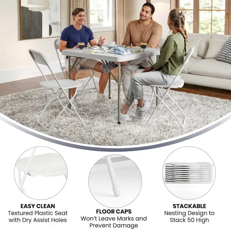 Commercial-grade plastic folding chairs designed to be lightweight but durable. This product is engineered and built with premium materials that will withstand heavy duty use for event, business and home usage. These folding chairs will nest easily to stack 50 high from the floor and feature a textured contoured plastic seat for the highest level of comfort and security. With a variety of color options you can choose what would best pair with your event needs. This is a commercial-grade on-demand seating solution convenient for weddings, school functions, barbecues, game night, and catering events. Stay comfortable during social events with the gentle contour shaped seat and back. Folding chair highlights: - Ready-to-use with no assembly required - Hassle free stackable storage - Textured seat designed for maximum comfort and security - Floor caps to prevent surface and flooring damage - 650LB weight capacity These low-maintenance party event chairs wipe down easily after luncheons and stack neatly for storage or floor maintenance. Make a smart investment by purchasing multiple plastic folding chairs for your rental business, waiting room or corporate training rooms. Purchase our folding chair truck for quick and easy set up and take down.