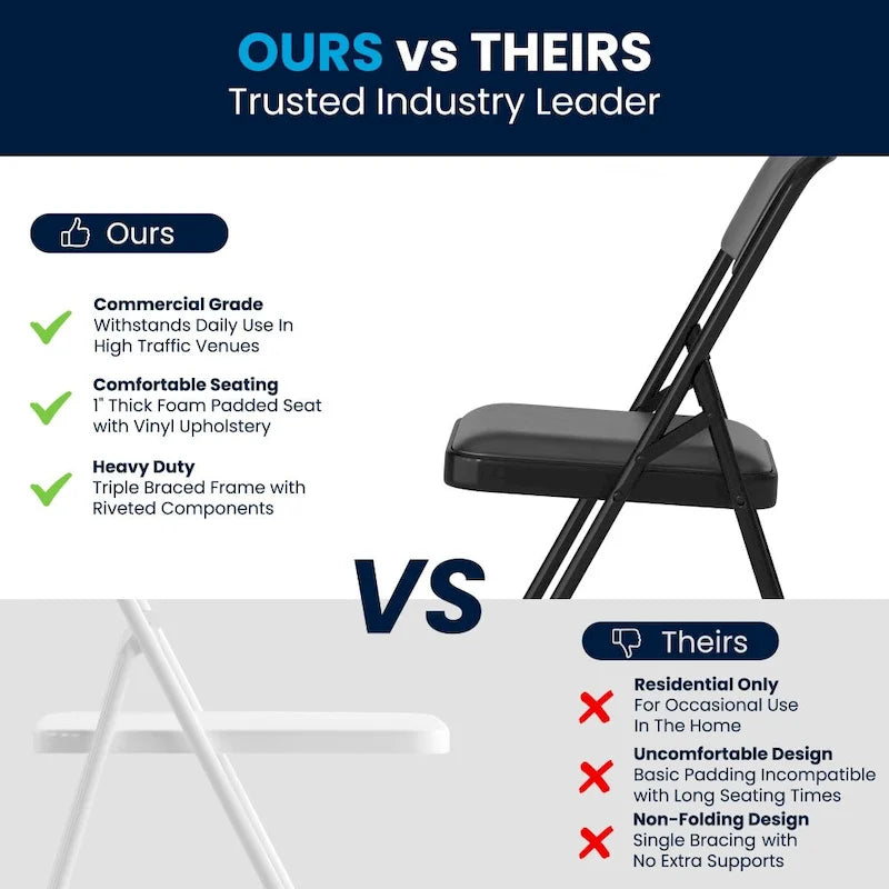 Host Thanksgiving at your house and leave out bring your own chair on the invite we've got you covered with these padded folding chairs. These heavy-duty metal folding chairs are built for commercial businesses who host a myriad of events and need to accommodate people of varying sizes. Portable chairs are ideal in community centers to transport from storage to venue floor. Change the scenery with these outdoor metal chairs by taking the party outside. Take care of your chairs so they last you many years by storing indoors. Its 18-gauge curved steel frame is triple braced with leg strengthening support bars to hold up to 300 pounds while the non-marring floor glides protect your flooring from scuffs and scrapes. Celebrate all family events at your home for guests to sit comfortably atop these upholstered folding chairs. These chairs come assembled to be of service as soon as they're delivered.