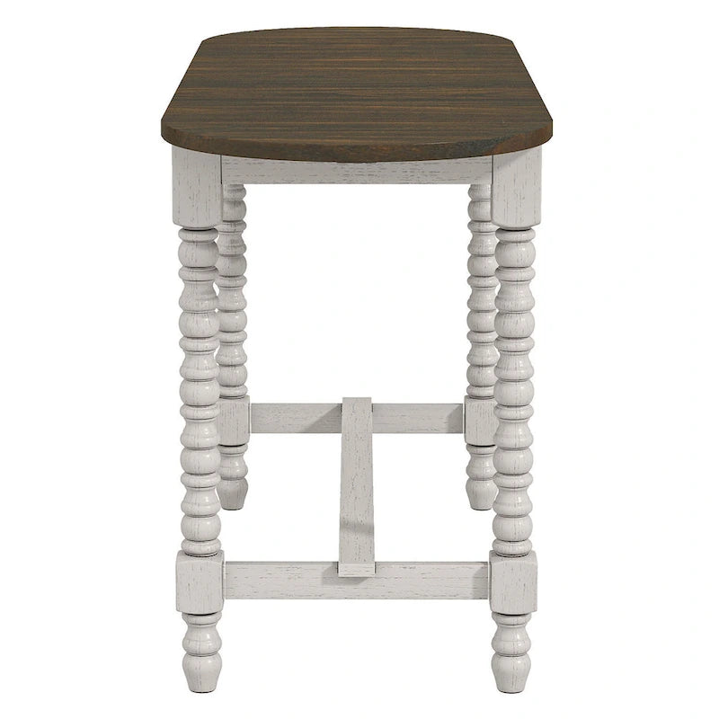 Create a cozy dining space for the family with this rustic counter height table. In dark walnut with two drop leaves, the tabletop is a versatile choice for a multi-functional space. The base adds turned accents and a distressed antique white finish for cottage-inspired flair.